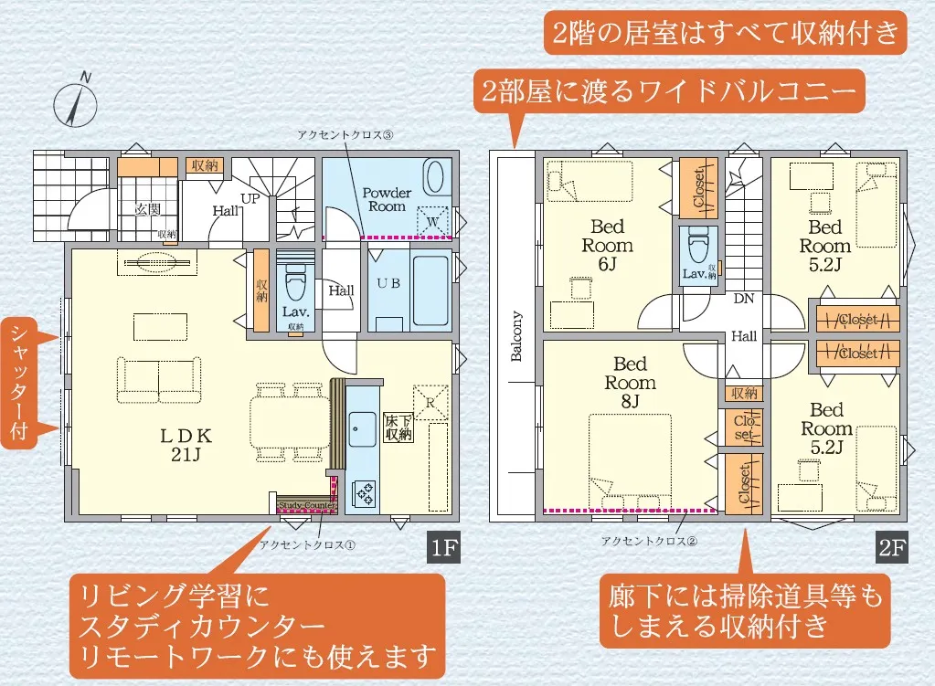 LDKは広々21帖!各居室収納付きです♪セカンドカーにも便利な駐車2台可!<2号棟>