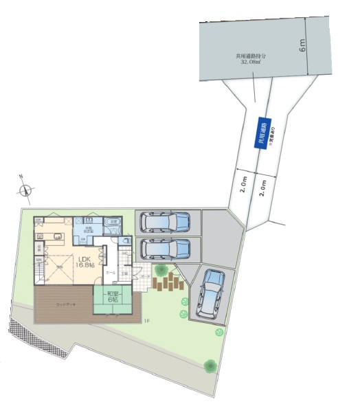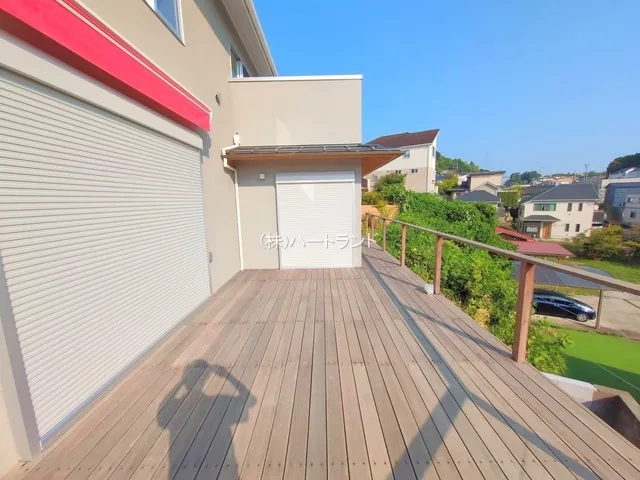大きなウッドデッキのある「和モダン住宅」パノラマ眺望のバルコニー、開放感ある吹き抜けのリビング、造作洗面台など見どころ満載の建物仕様☆カースペースは3台!