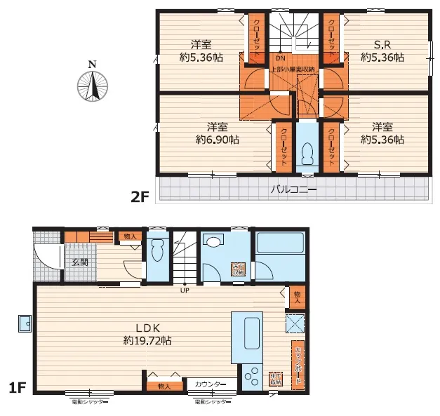 南西角地で日当たり良好!カースペース2台分あり(車種による)全居室収納、小屋裏収納もあり収納豊富です♪